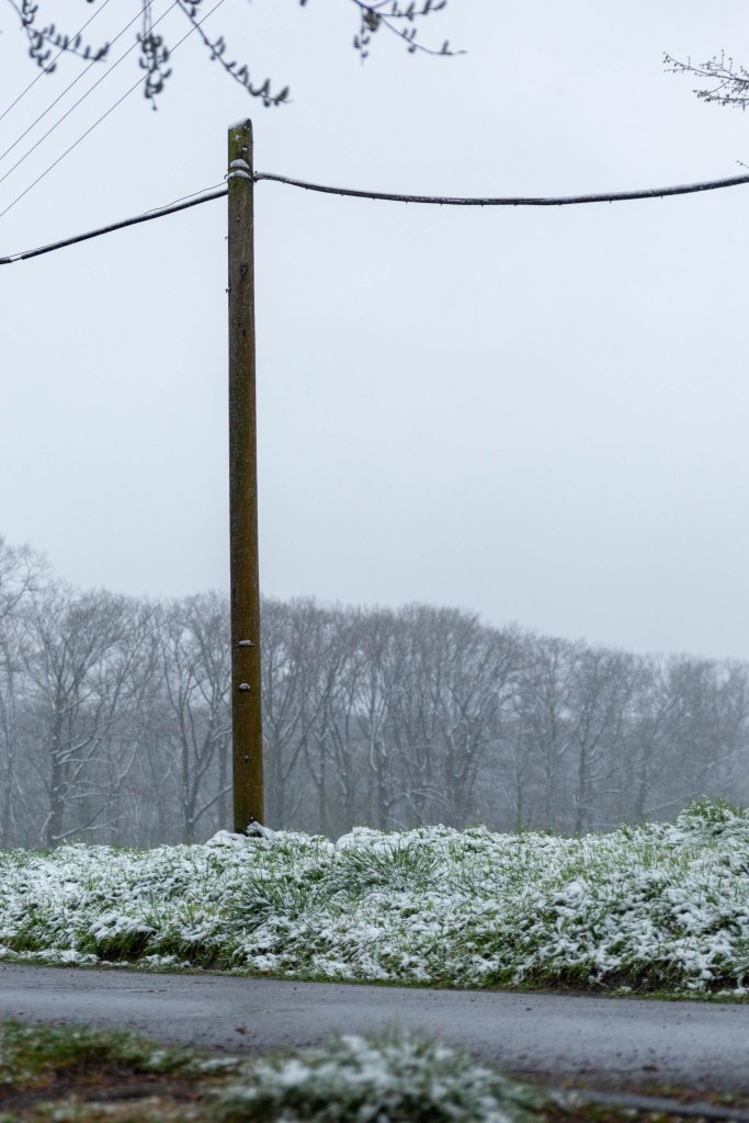 Am anderen Waldrand angekommen, führt mich mein Weg auf eine schmale Straße zwischen zwei kleinen Feldern. Auf der linken Seite stehen wunderbar aus der Zeit gefallene alte Leitungen.