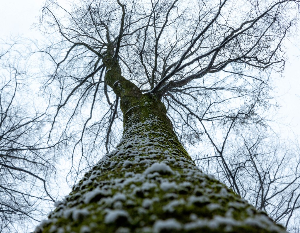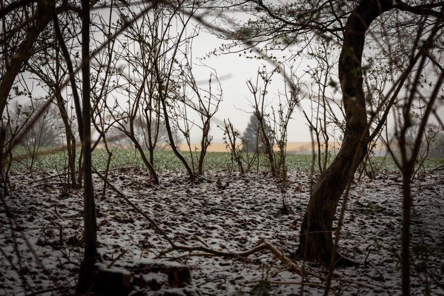 Obwohl die großen Buchen und Eichen noch kahl sind, erkennt man an Büschen viele grüne Blätter unter der sanften Puderzuckerschicht. Man merkt, wie der Frühling bereitsteht herauszuplatzen um alles wieder zu einem satten, undurchsichtigen und schattigen Geflecht voll von Gerüchen, Vogelrufen und Bachgeplätscher zu verwandeln. Doch noch steht der Wald sanft und stumm: der wenige Schnee schluckt den Schall.