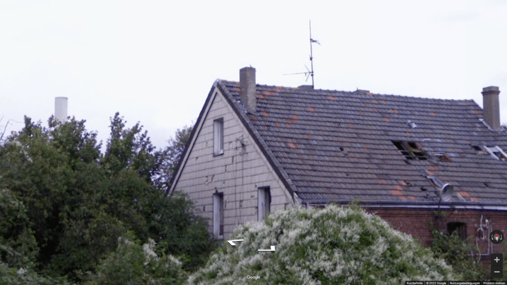 Doch irgendwann danach muss das Haus verlassen worden sein. Erzählungen meines Bruders nach, war das Haus in der 2000ern schon eine Ruine. Die Google-Streetview-Aufnahmen von 2008 zeigen das Haus noch mit intaktem Dachstuhl, doch Zeichen des Verfalls sind schon offensichtlich. Auf diesen Bildern thront im Hintergrund noch der Abluftkamin der Opel-Lackiererei.