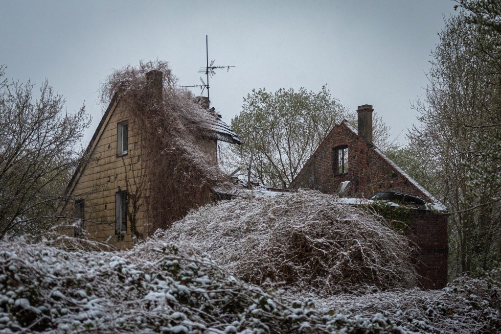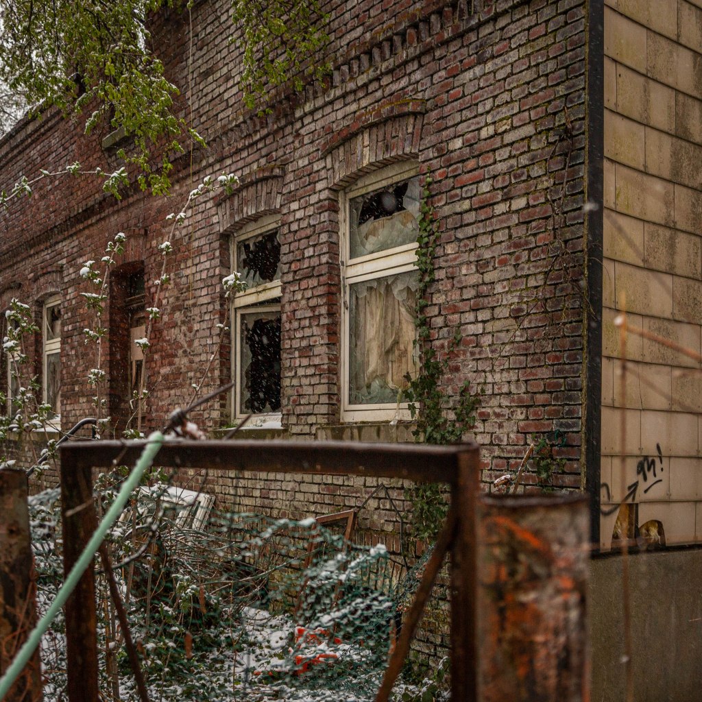 Ohne Dach gibt es nichts mehr, was den Schnee am eindringen hindert. Dieses schöne Ziegelhaus hat den Wandel der Zeit nicht gut überstanden. Versteckt zwischen Wald und einem kleinen Hof gelegen, überwuchert von Sträuchern ragen die zwei Giebelwände noch deutlich empor. Höher noch hebt sich die Antenne in den Äther, als gäbe es hier noch jemanden der etwas empfängt. Doch der Dachstuhl ist eingestürzt, auch der Dachboden fehlt. Die Sträucher wuchern bis zur Traufe und den Giebel hoch, hinauf bis über den Schornstein. Die im Kreuzverband gemauerten Ziegel mit schmucken Gesimsbändern und gemauerten Flachstürzen sind simpel aber schön; Zeugnis heute selten gewordener Handwerkskunst.